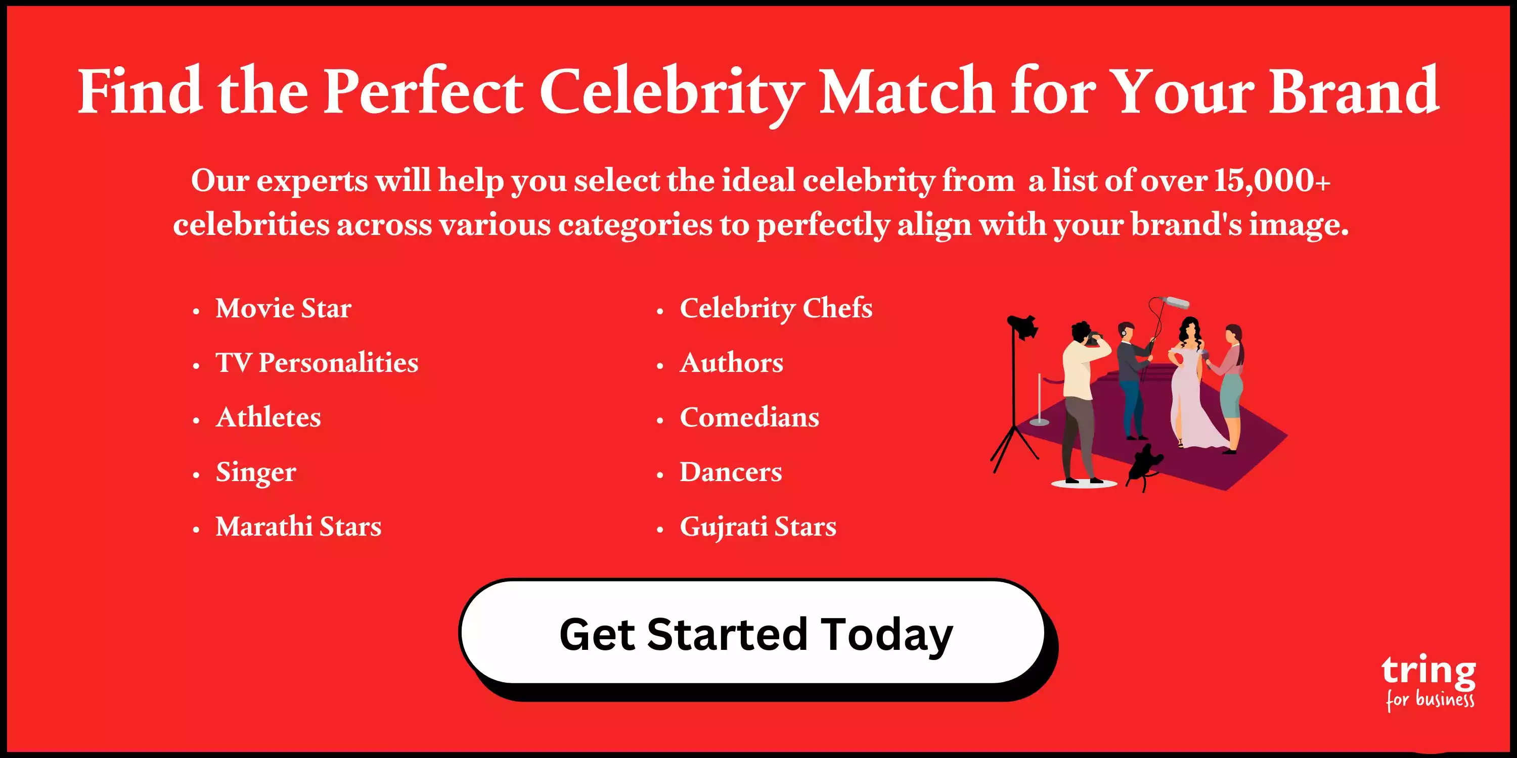 Analyzing all these factors is a major task that will take your time and as you are not an expert in it, you may still not be able to choose the perfect celebrity for your brand. For expert assistance, Tring brand representatives can help you select the ideal celebrity by analysing all factors to choose a celebrity from a pool of over 15,000+ options, including movie stars, TV personalities, cricketers, singers, regional artists and more.
