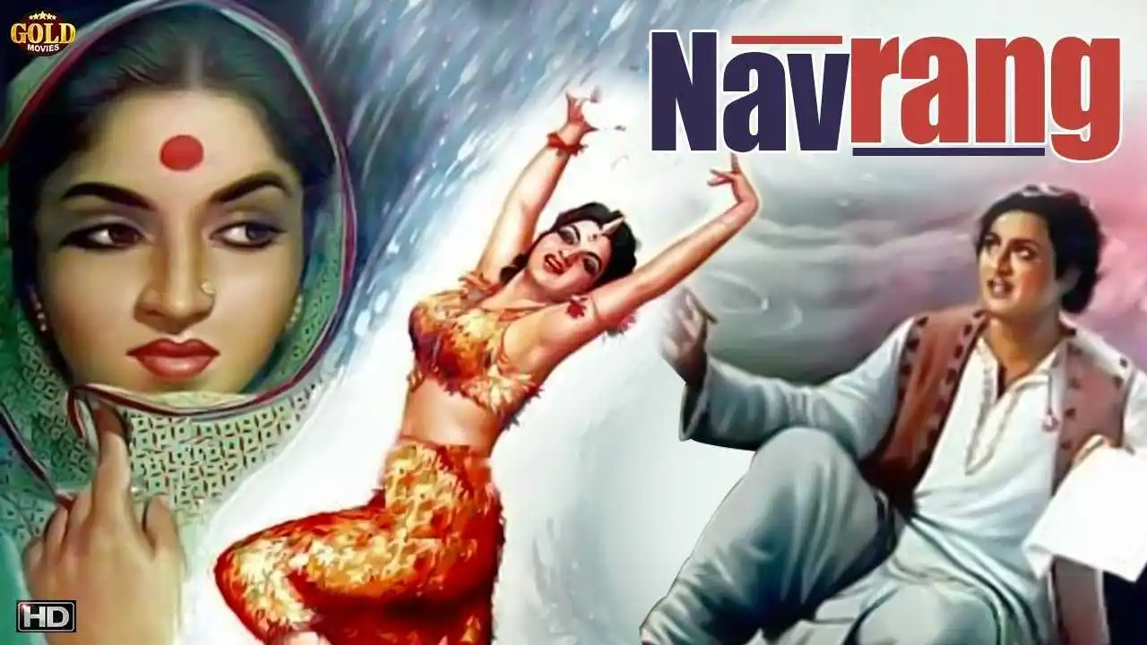 The 1959 Hindi-language film Navrang was co-written and directed by V. Shantaram. While playback singer Mahendra Kapoor made his singing debut with the song Aadha Hai Chandramaa Raat Aadhi the movie is known for its dance sequences featuring main actress Sandhya and music by C. Ramchandra.