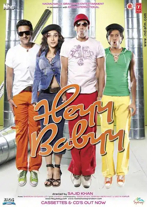 An Indian comedy titled Heyy Babyy was produced by Sajid Nadiadwala and directed by Sajid Khan in 2007. Starring in it are Boman Irani Vidya Balan Juanna Sanghvi Fardeen Khan Riteish Deshmukh and Akshay Kumar. The main plot of this movie is loosely based on the Malayalam movie Thoovalsparsham (1990) which was itself an adaptation of the American movie Three Men and a Baby (1987) which was itself based on the French movie Three Men and a Cradle.